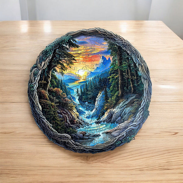 The pieces are wooden and laser cut into unique shapes and images. The pieces are interesting and fun, even before you start to put the puzzle together. The puzzle itself is vibrant, sturdy.
