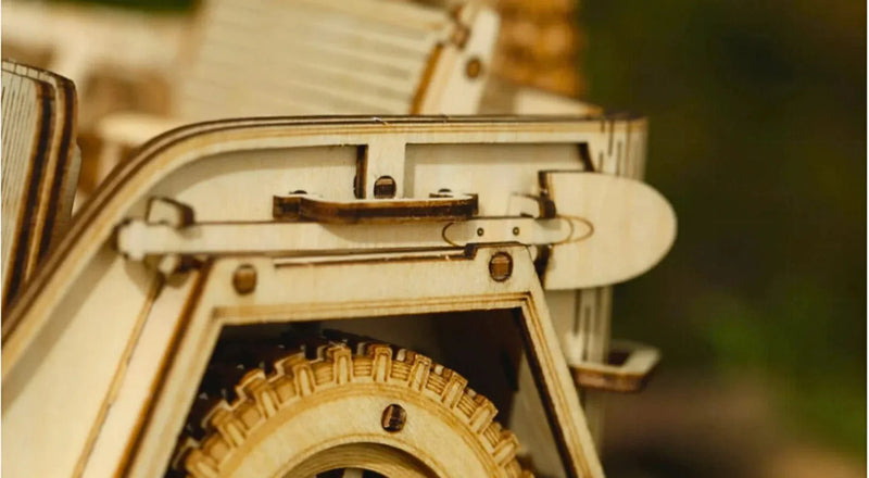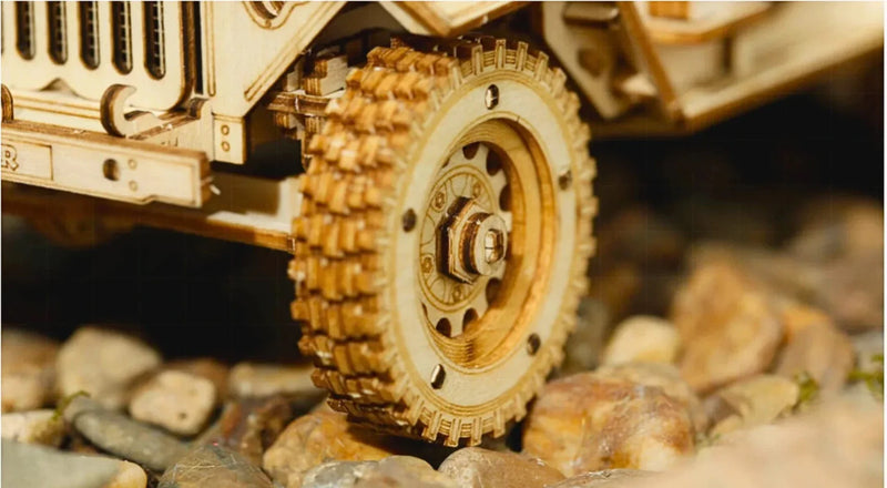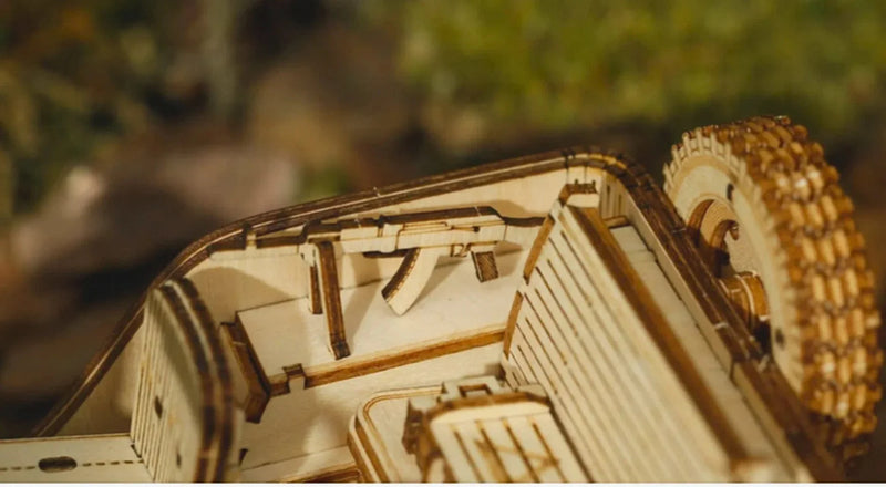 This Army Jeep Scale Model 3D Wooden Puzzle meticulously recreates the resilient military vehicle, complete with the rugged wheels typical of an off-road Jeep and the weapon decor outfitted on the vehicle. This 1:18 scale model is a self-assembly kit that accurately portrays the tough, robust mechanisms of an authentic military field vehicle.