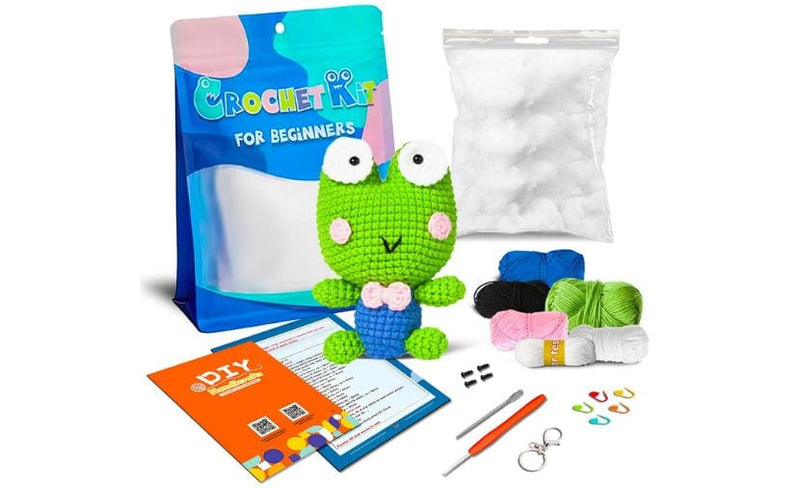 The All-In-One crochet starter kit includes: a dual-tip crochet hook, stitch markers, a blunt needle for attaching the eyes, craft eyes, soft filling material, various yarns, a comprehensive guidebook, and a convenient carrying pouch for the entire set.