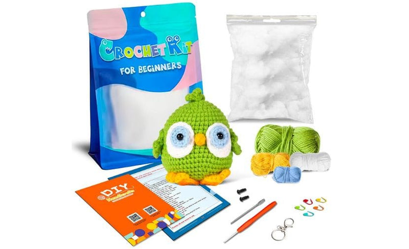 The All-In-One crochet starter kit includes: a dual-tip crochet hook, stitch markers, a blunt needle for attaching the eyes, craft eyes, soft filling material, various yarns, a comprehensive guidebook, and a convenient carrying pouch for the entire set.