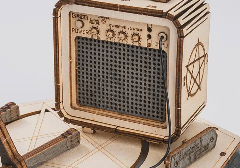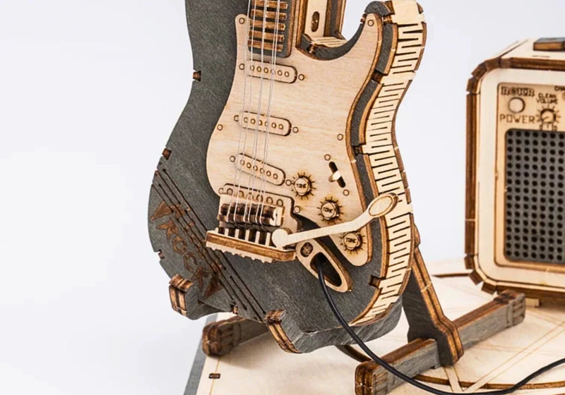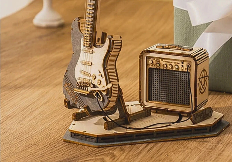 The Perfect Gift for Music Lovers: This mini guitar model, with its fine details and accurate proportions, is a delight for any music enthusiast. Masterfully designed, each part of this model, from body to headstock, strings to pickups, and even the amplifier, are created using high-standard materials with precision laser-cut technology, making it an exquisite and intricate representation of an electric guitar.