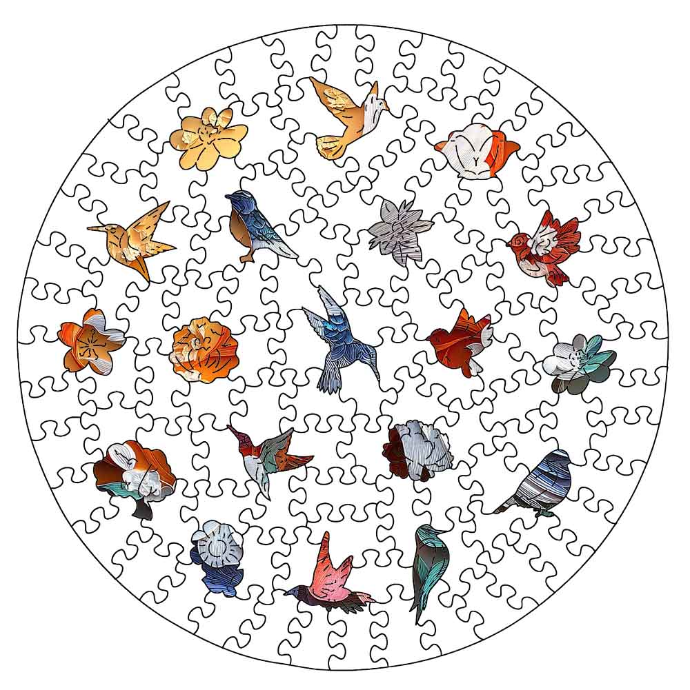The pieces are wooden and laser cut into unique shapes and images. The pieces are interesting and fun, even before you start to put the puzzle together. The puzzle itself is vibrant, sturdy.