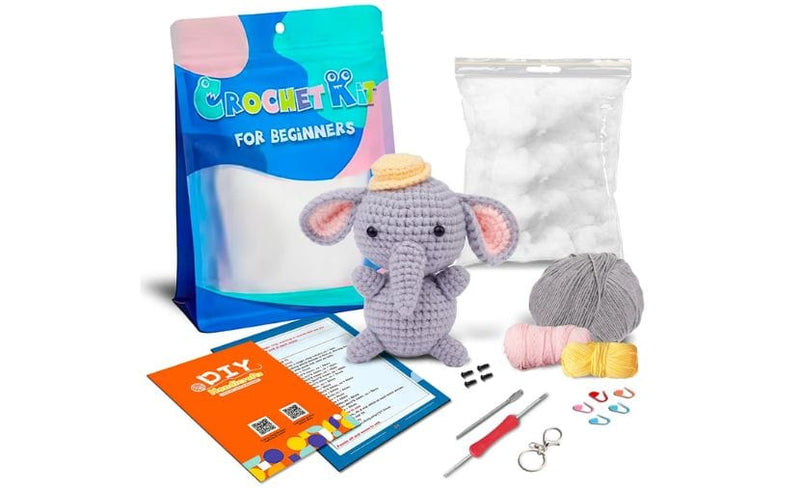 The All-In-One crochet starter kit includes: a dual-tip crochet hook, stitch markers, a blunt needle for attaching the eyes, craft eyes, soft filling material, various yarns, a comprehensive guidebook, and a convenient carrying pouch for the entire set.