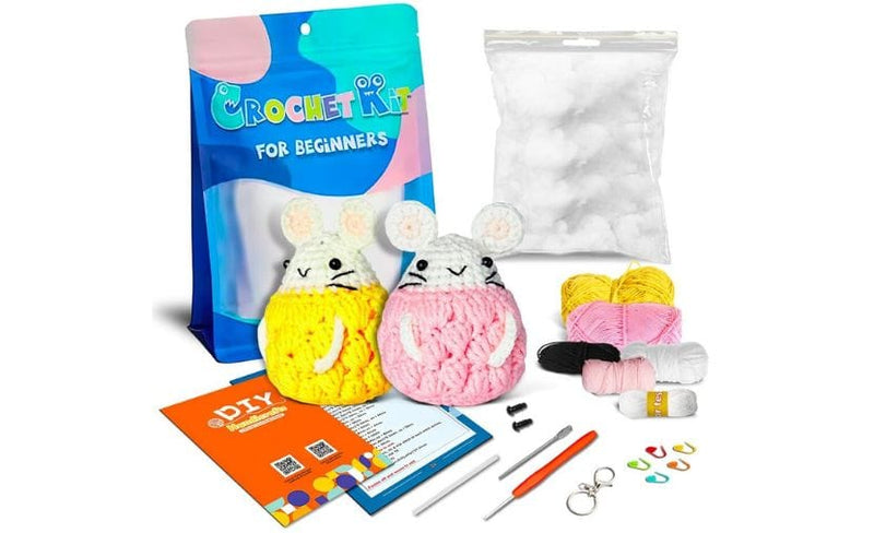 The All-In-One crochet starter kit includes: a dual-tip crochet hook, stitch markers, a blunt needle for attaching the eyes, craft eyes, soft filling material, various yarns, a comprehensive guidebook, and a convenient carrying pouch for the entire set.