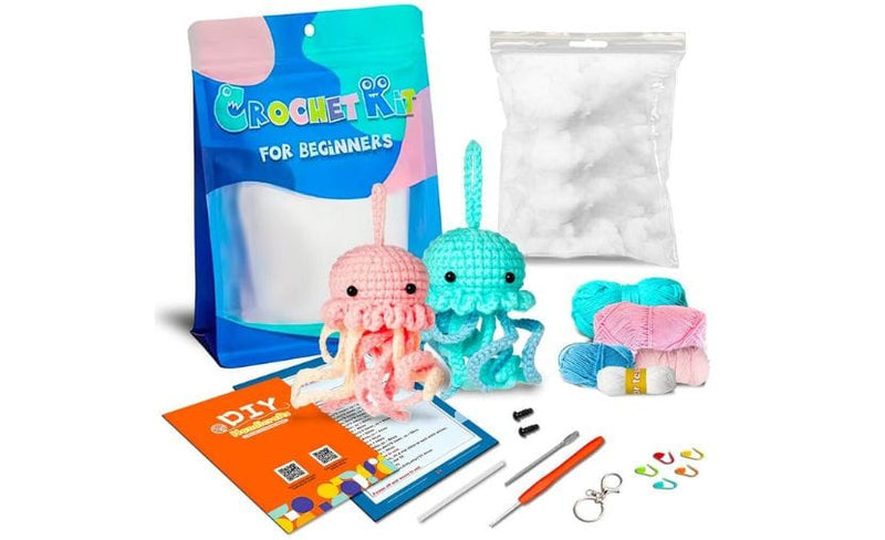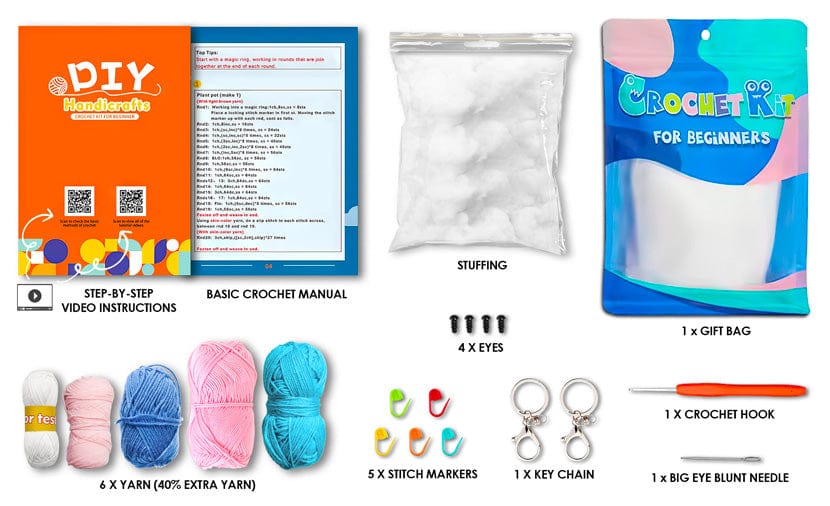 The All-In-One crochet starter kit includes: a dual-tip crochet hook, stitch markers, a blunt needle for attaching the eyes, craft eyes, soft filling material, various yarns, a comprehensive guidebook, and a convenient carrying pouch for the entire set.