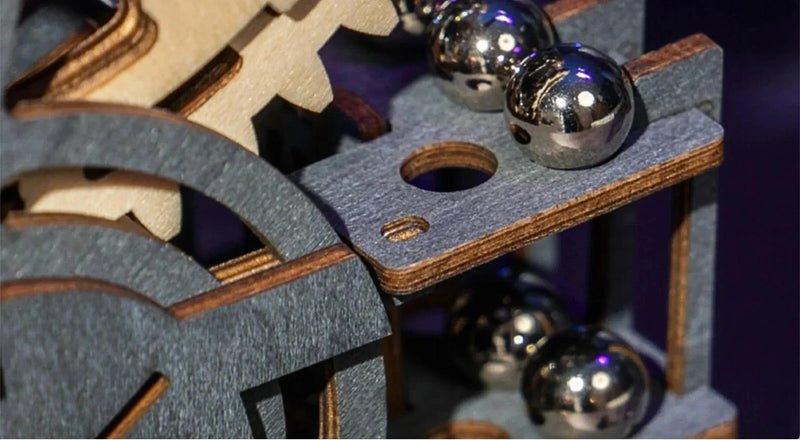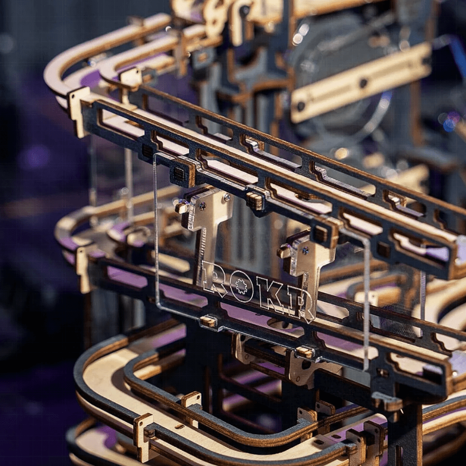 This marble run, a fusion of science and mechanics, features various gadgets in a 3D wooden puzzle. With 294 pieces and 10 marbles, build a fortress with tower distributors and track race balls. Rotate the handle to watch marbles zoom down intricate paths.