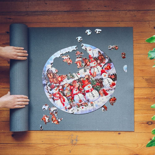 Lay out the mat to begin your puzzle. To save your progress, insert the inflated tube at one end and evenly roll up the mat. Secure each end with the elastic bands to keep everything in place.