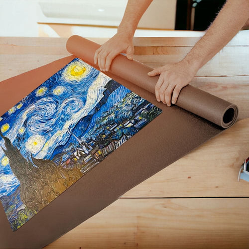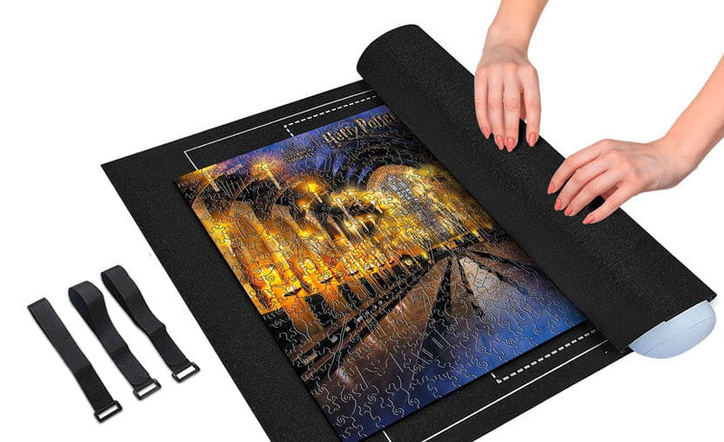 This tube ensures safe storage of your unfinished puzzle until next time. To keep the puzzle pieces from shifting, 3 elastic bands are provided to secure the ends of the rolled-up mat.