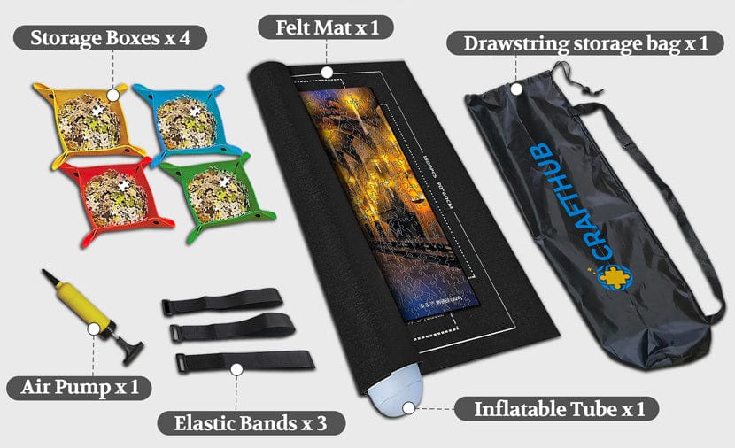 Include a mini hand pump for inflating the tube. Also, 4 colored felt sorting trays are provided. These foldable trays help you organize puzzle pieces by color or shape, enhancing the efficiency of your puzzle experience.