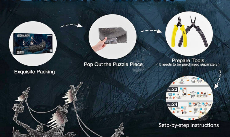 Upon assembly, this metal model skillfully replicates the legendary Sea Ghost Pirate Ship. Cursed and stranded in the Devil Delta, the model honors this formidable vessel and its skeleton crew, inviting you on a historical exploration of maritime lore.