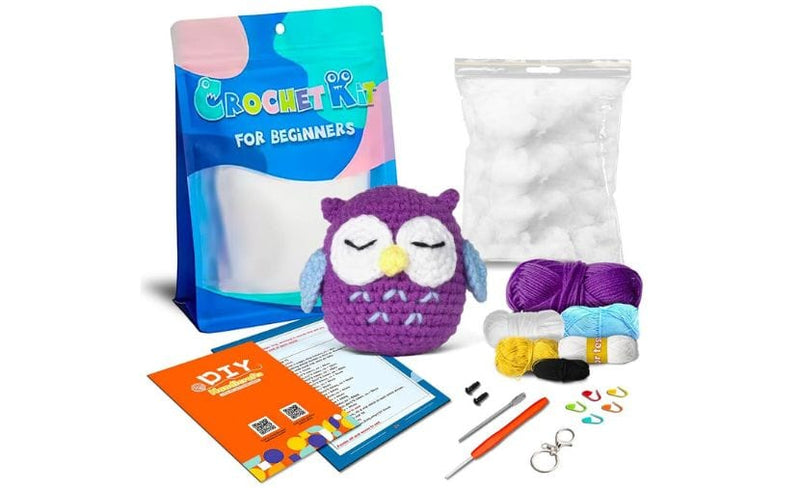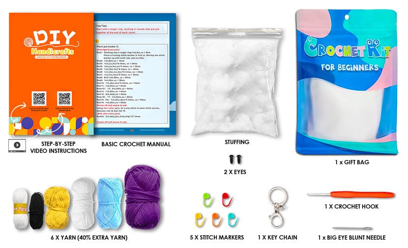 The All-In-One crochet starter kit includes: a dual-tip crochet hook, stitch markers, a blunt needle for attaching the eyes, craft eyes, soft filling material, various yarns, a comprehensive guidebook, and a convenient carrying pouch for the entire set.