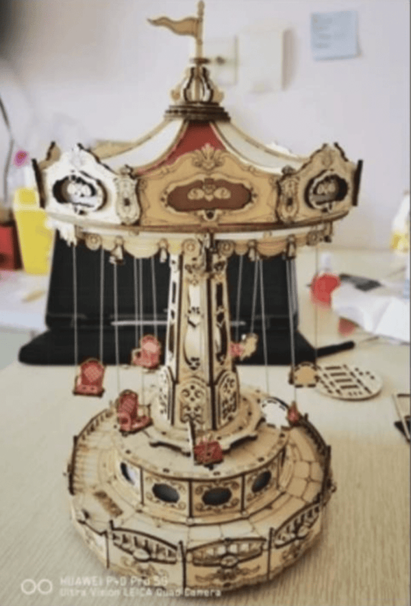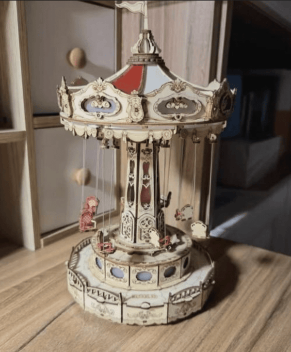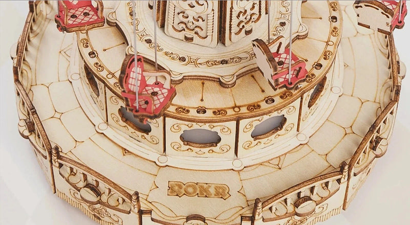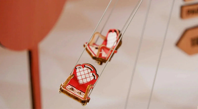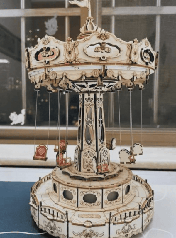 The Swing Ride Music Box retro ceiling shape, adorned with valance and lamp belt, exudes a romantic and warm ambiance, evoking a delightful classical charm. The central pillar boasts six sides made of mirror material, which, when illuminated, transforms into a mystical magic mirror, reflecting the enchantment of a paradise and enhancing the overall depth and allure. Featuring a built-in movement, the seats of the carousel will gracefully suspend from the rotating top, accompanied by enchanting music and illuminated by vibrant lights, all at the touch of a button.