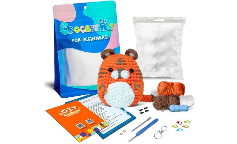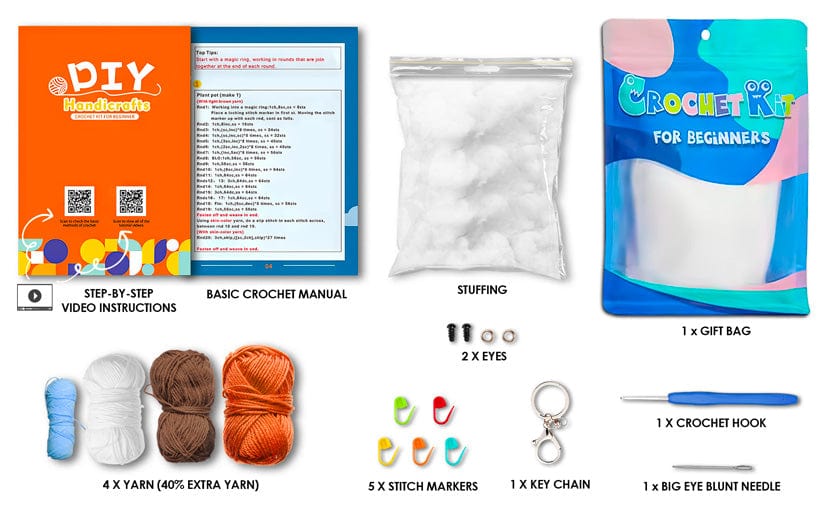 The All-In-One crochet starter kit includes: a dual-tip crochet hook, stitch markers, a blunt needle for attaching the eyes, craft eyes, soft filling material, various yarns, a comprehensive guidebook, and a convenient carrying pouch for the entire set.