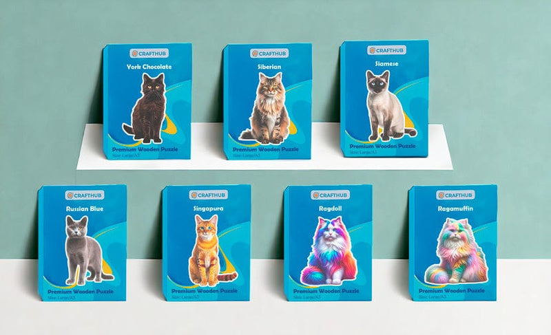 Delve into an expansive celebration of feline beauty with our wooden jigsaw puzzle series, showcasing over 50 unique cat breeds from across the globe.