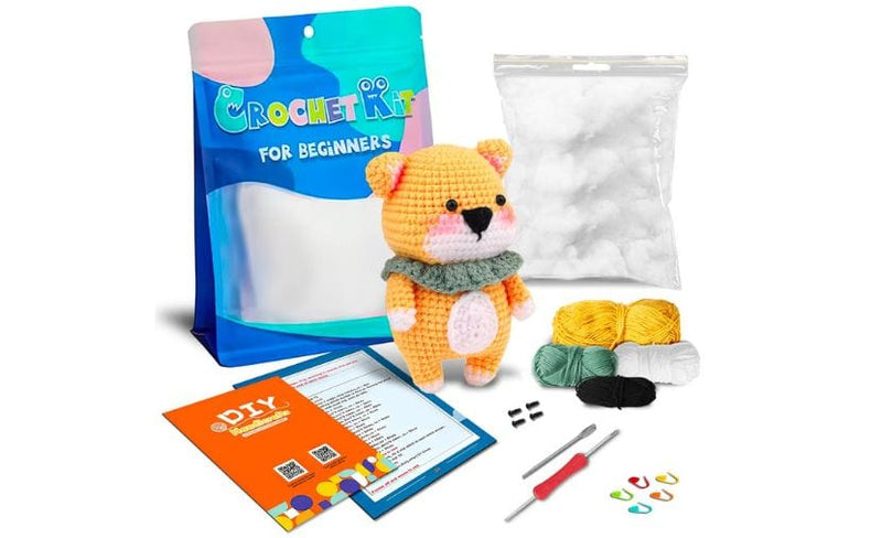 The All-In-One crochet starter kit includes: a dual-tip crochet hook, stitch markers, a blunt needle for attaching the eyes, craft eyes, soft filling material, various yarns, a comprehensive guidebook, and a convenient carrying pouch for the entire set.